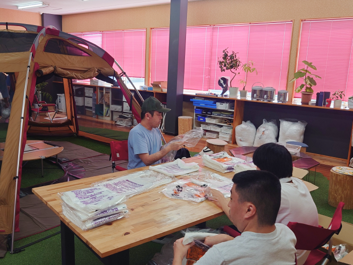 企業様との委託契約による施設外就労や事業所内の軽作業など、さまざまな仕事を用意。人口芝を敷いたキャンプ気分の空間にも、ぜひお立ち寄りください。